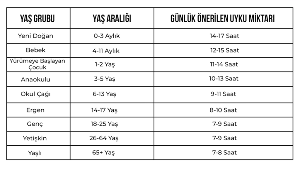Başarılı ve sağlıklı olmak isteyen kişilerin günlük en az 7 saat uyuması gerekmektedir. Ancak farklı yaş grupları için bu durum farklılık göstermekte, örneğin LGS sınavına hazırlanan bir öğrencinin günlük en az 8 saat kesintisiz uyuması gerekmekte. YKS ve KPPS sınavlarına hazırlanan öğrencilerin ise günlük en az 7 saat uyuması yeterli olacaktır.